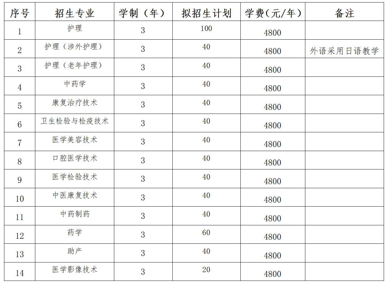 注:护理(涉外护理)专业,外语采用日语教学,只参加一志愿的录取,不参加二、三志愿及服从志愿录取。